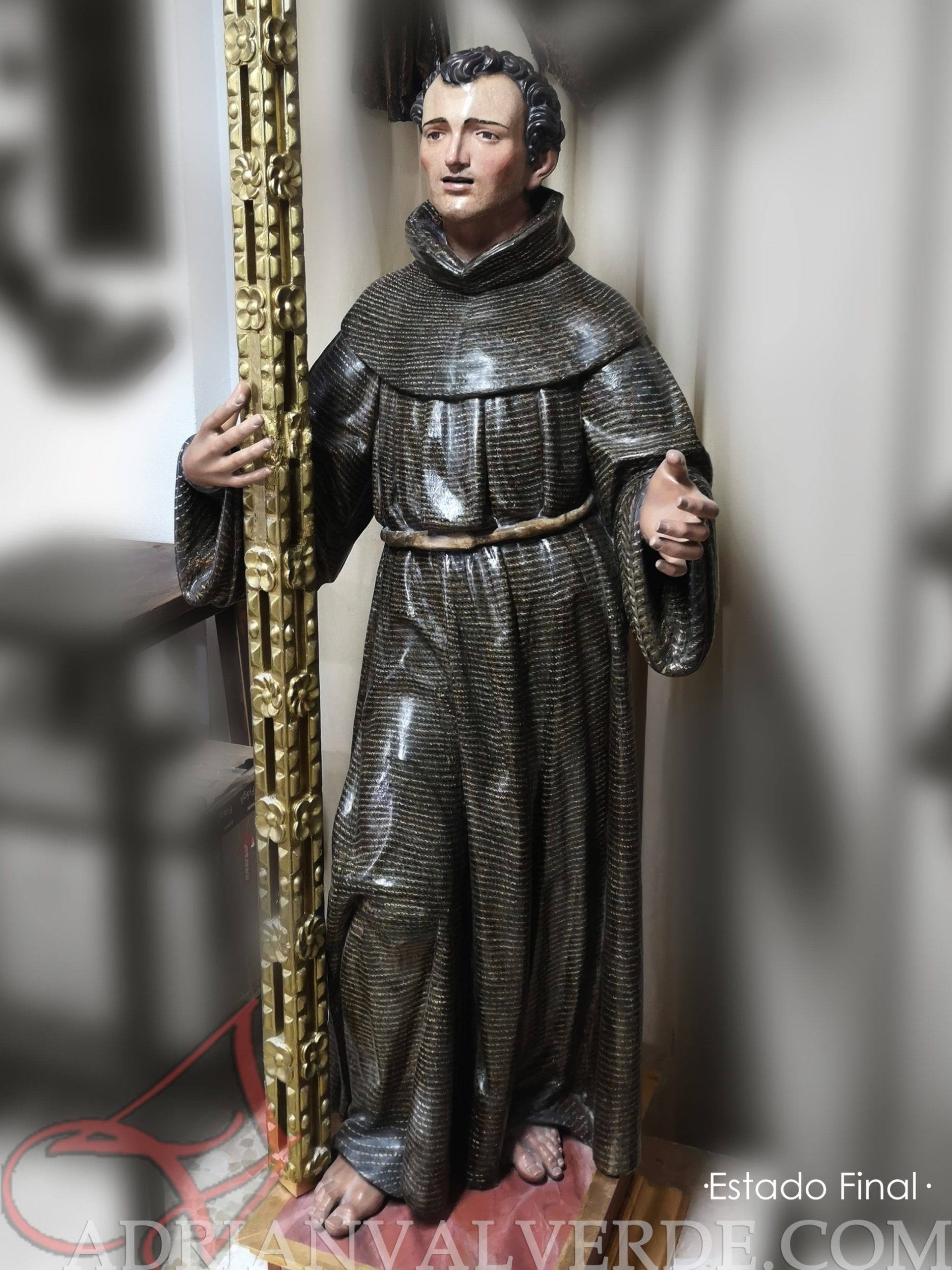 Esta primera fase de restauración se ha centrado en la zona del busto, manos y pies, así como la sustitución de la peana por una totalmente nueva, con acabado de imitación a mármol rojo y molduras doradas con pan de oro alemán, dejando así para una segunda fase, la cruz y toda la zona del hábito, en la cual simplemente se han resanado varios desconchones, realizando una nueva cogida oculta en el brazo derecho para el anclaje de la cruz, eliminando por otro lado, un gran postizo de escayola que daba forma a la bocamanga de la mano derecha, la cual se ha reconstruido con varias piezas de madera y pasta de restauración, además, se han realizado varias catas en las que se ha descubierto que, bajo las gruesas capas de repintes, se encuentra totalmente dorada y estofada.
