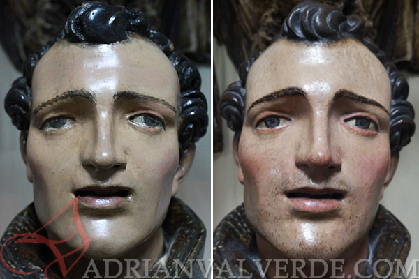 La intervención continuó en la zona del rostro, qué tras varias catas, se llega a encontrar hasta tres capas de repintes, los cuales son retirados, hallando felizmente la policromía original, cargada de tonalidades y descubriendo que posee un “peleteado” simulando el nacimiento de la barba, así como las pestañas inferiores, resanando toda la zona de grietas y lagunas reintegrando la policromía con técnicas reversibles.