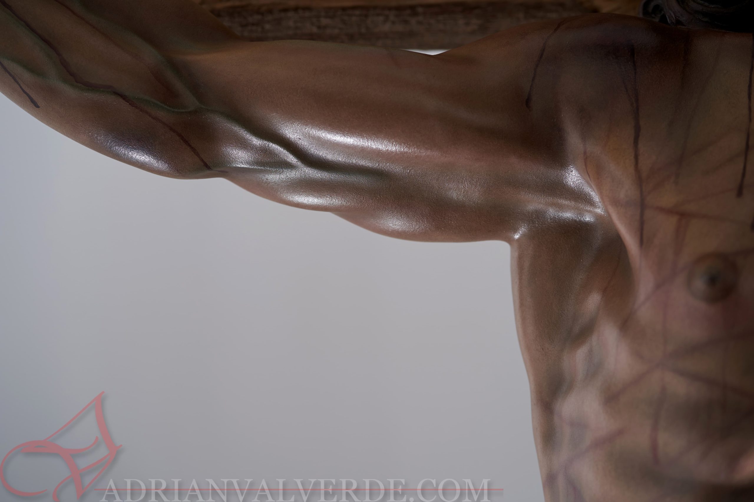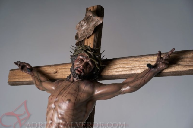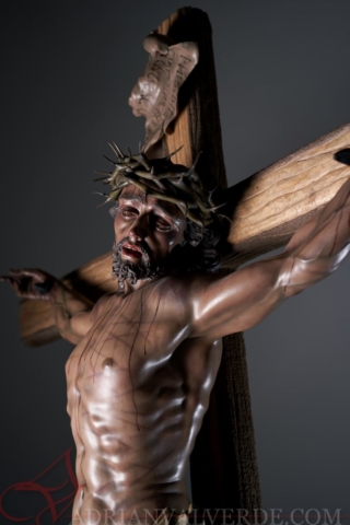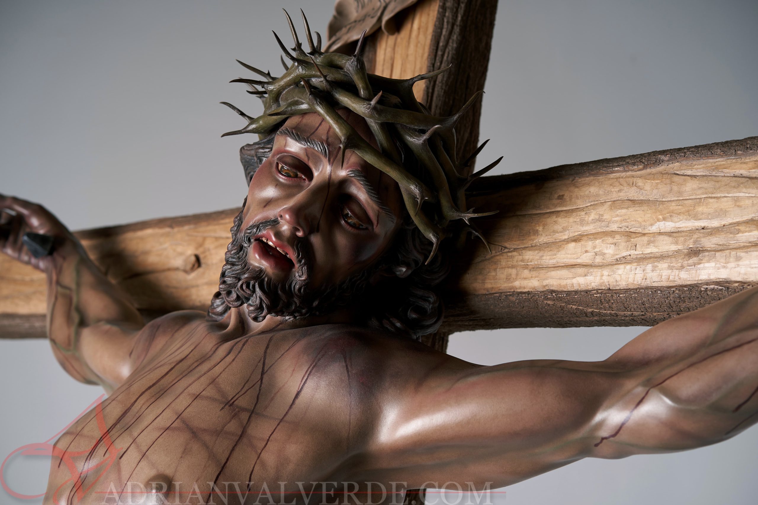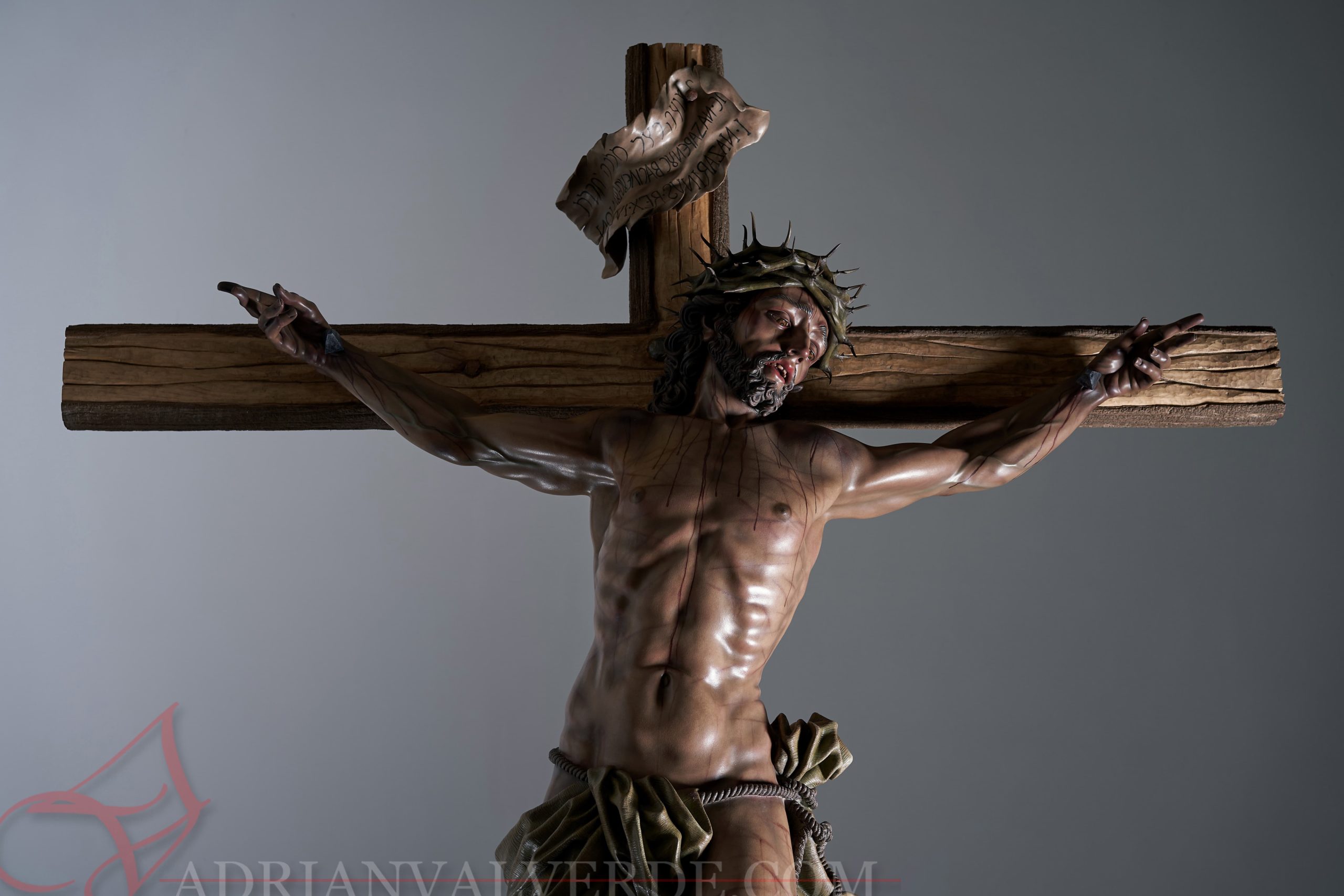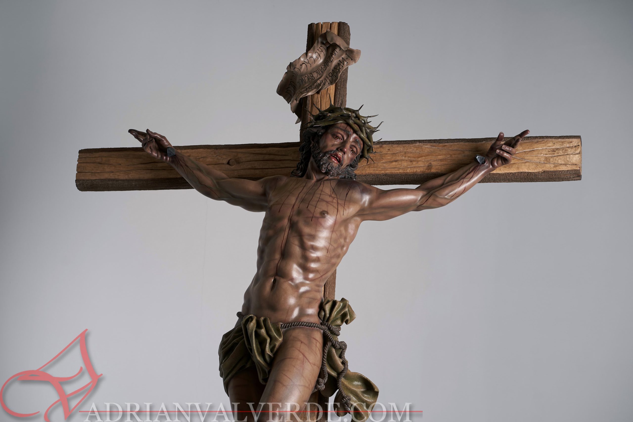Imagen de Cristo Crucificado, representado en el momento de su elevación, clavado por tres clavos, en las muñecas de las manos y uno que atraviesa los pies, apoyando el izquierdo sobre el derecho y éste a su vez sobre un suppedaneum. Perizoma cordífero atado en la cadera izquierda y que deja completamente a la vista la misma. Talla realizada íntegramente en madera de cedro a tamaño natural, 185cm aprox. acabados de policromía al óleo, rica en tonalidades, heridas, hematomas y regueros de sangre a base de veladuras y transparencias, finalizado con diferentes pátinas consiguiendo una tez morena. Rostro estremecedor y agonizante causado por el momento, ojos color miel y mirada baja, directamente comunicada con la futura imagen secundaria del buen ladrón «Dimas» que irá al pie de la cruz encomendándose a Cristo. Titulus Crucis tallado en madera de cedro, clavado por un clavo y que bordea la cruz debido a la inclinación de la misma.